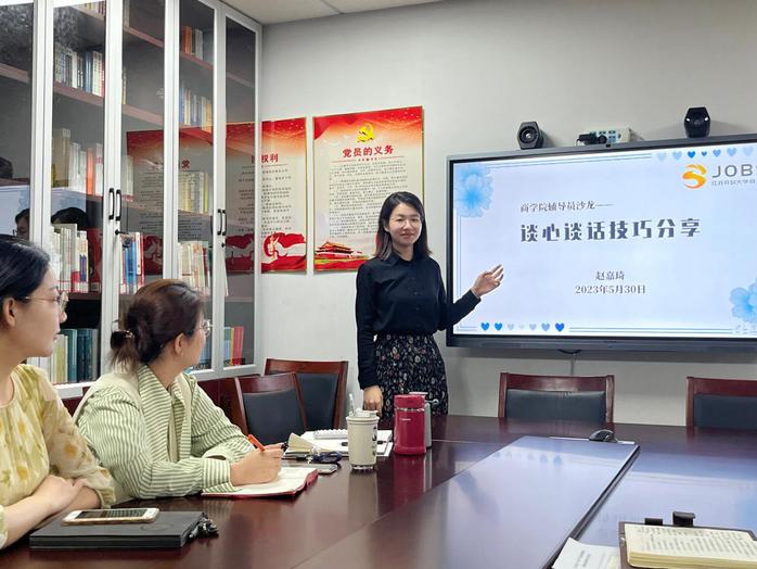 为加强交流和学习互鉴,提升业务能力和水平,科学有效地掌握谈心谈话的方法和技巧,2023年5月30日上午10:00,商学院2023年第三期辅导员沙龙在东校区综合楼304室召开。本次沙龙由学院党总支副书记丁晓华主持,王姣姣、赵嘉琦两位老师围绕“谈心谈话技巧”主题进行经验分享,全体辅导员参加了活动。