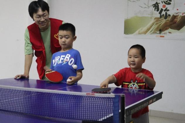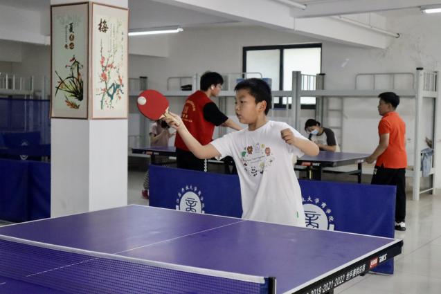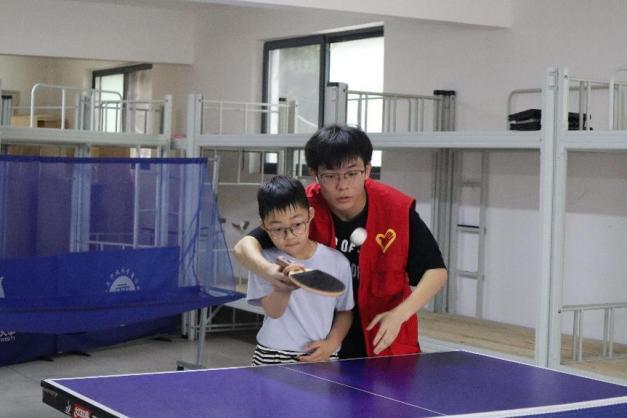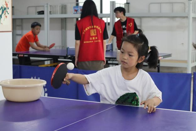 另一组小朋友在乒乓球室开展活动,由王芳芳、夏泽明、王火鑫等学生志愿者向小朋友讲解乒乓球的规则以及打法,传授打球技巧,主动帮助小朋友调整握拍姿势以及接球姿势等,带领小朋友近距离感受乒乓球的魅力,同时向家长们介绍乒乓球运动的发展历史。