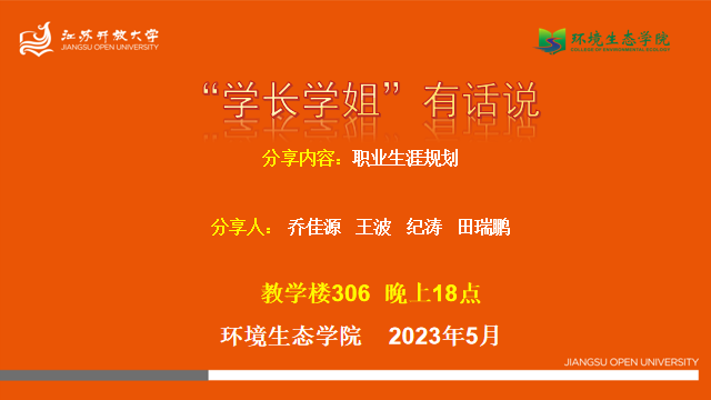 为帮助学生更合理地规划职业生涯,5月30日晚,环境生态学院在应天校区教学楼306开展“学长学姐有话说”大学生职业生涯规划分享会。活动邀请了20级四位优秀毕业生从大学职业生涯规划、升学和就业求职方向与21级、22级学生进行了深入的分享与交流,学工办主任陈涛涛、辅导员高媛媛、谢伟芳参加。