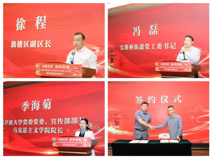 在校地结对共建启动仪式上,鼓楼区副区长徐程对此次校地合作共建活动的成功启动表示祝贺。徐程指出,深入贯彻落实党的二十大精神、推动生态文明建设需要全社会的共同参与,宝塔桥街道和江苏开放大学马克思主义学院建立长期紧密合作关系,是对生态环境保护研学共建的积极探索和创新,将有力推动鼓楼生态文明建设迈上新台阶。