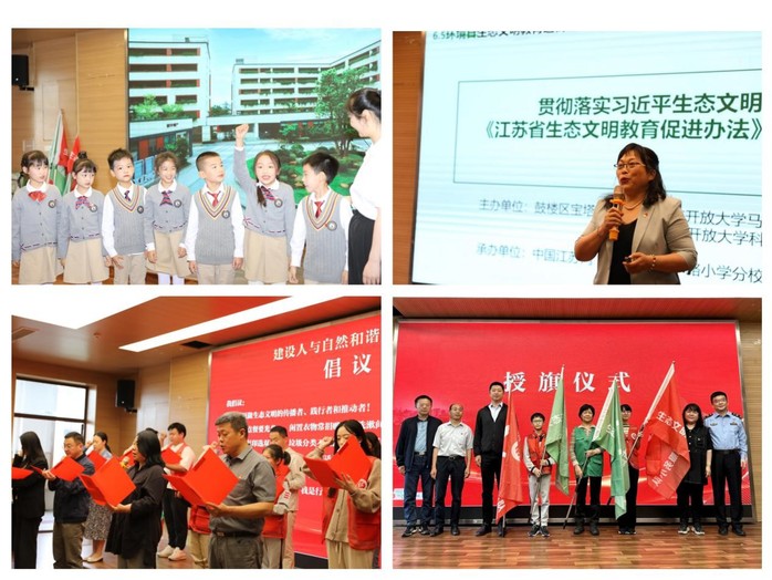 随后,学院张玉兰教授面向全体参加人员进行生态文明教育专题思政大课授课。本次大课由《芳野寻踪》情景剧、《贯彻落实习近平生态文明思想——对<江苏省生态文明教育促进办法>的解读与思考》主题授课、“美丽江苏,美丽中国,我是行动者”共同倡议等环节组成。方兴小学二年级的同学们在老师的带领下演绎《芳野寻踪》,孩子们变身“植物观察员”,探索校园里的植物奥秘,讲述与绿色校园的奇妙相遇。张玉兰围绕“立法背景、基本内容、主要特点和实践行动”等方面,对《江苏省生态文明教育促进办法》进行阐释。鼓楼区文明办、教育局、生态环境局及水务局负责人为“生态文明志愿服务小队”授旗,江苏省环保形象大使、江苏省优秀环保志愿者、江苏绿色之友秘书长王丽娜与全体人员宣读《建设人与自然和谐共生的现代化》生态文明倡议书。大家纷纷表示,要将理论学习转化实践成效,今后将从节约每一滴水、每一度电、每一张纸做起,践行“绿色低碳”的生活方式,为自己和他人创造良好的生产生活环境。