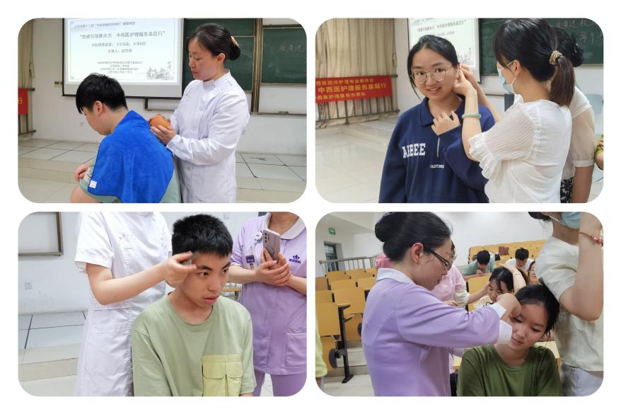 “同学们,你们知道耳廓有几个穴位吗?”“这些穴位和人体的五脏六腑有着怎样的关系呢?”来自江苏省第二中医院中医护理小组督导高雪琴护士长用幽默风趣的语言,通俗易懂地讲解,为同学们带来中医科普讲座《小耳朵,大学问》,她还贴心地为大家带来一段“耳穴按摩操”。讲座后,中医护理小组成员为同学们开展了诊疗活动,运用中医特色技术耳穴埋籽、头部刮痧和火龙罐等,针大家提出的肩颈腰腿疼痛、近视、面部痤疮等问题开展中医辨证施技。现场同学们都积极踊跃地参与中医外治法的效果体验。