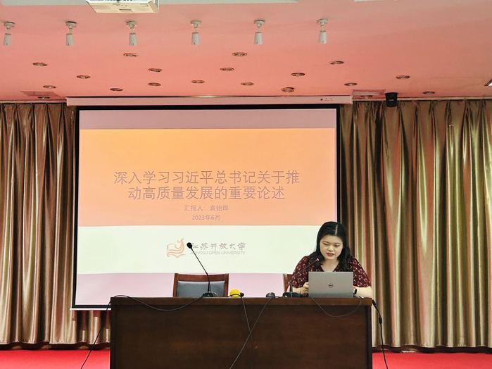 2023年6月21日上午,商学院党总支副书记董昕灵在图书馆五楼报告厅讲授专题党课,主题为“加快实施创新驱动发展战略,以科技创新推动学院高质量发展”,商学院党总支理论学习中心组全体成员以及学院其他教职工参加学习会。
