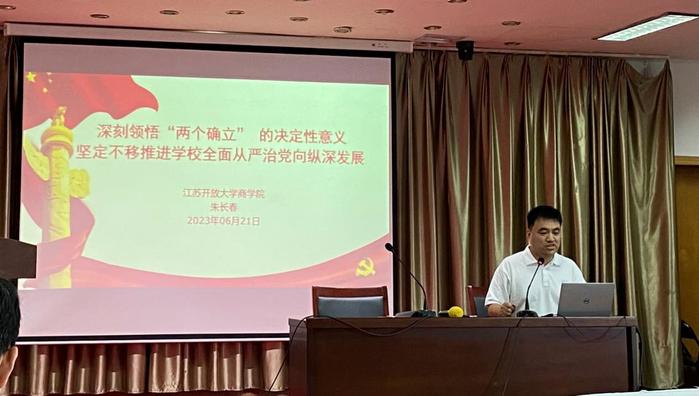 为进一步深入开展学习贯彻习近平新时代中国特色社会主义思想主题教育,6月21日上午,商学院第一党支部书记面向学院全体教职工及支部党员讲授主题为《深刻领悟“两个确立”的决定性意义,坚决把“两个确立”体现到实际行动中》专题党课。