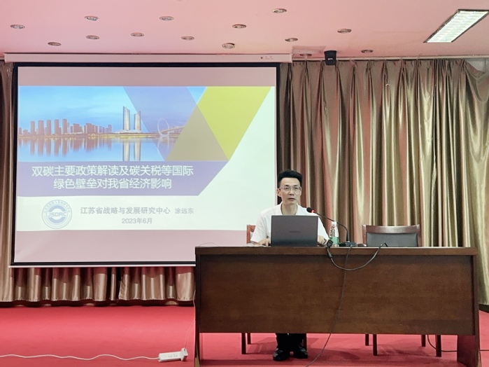随后,涂远东为全场带来题为《“双碳”主要政策解读及国际绿色壁垒对我省经济影响》讲座,讲座全篇围绕“双碳”问题展开,解读了欧盟碳排放交易体系的最新政策,阐述碳关税等对我省相关产业贸易现状及未来的影响,分析了我省在碳排放相关产业现状及存在的主要问题,并提出了相应的对策建议。