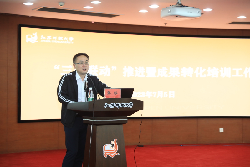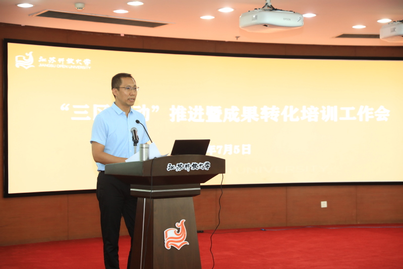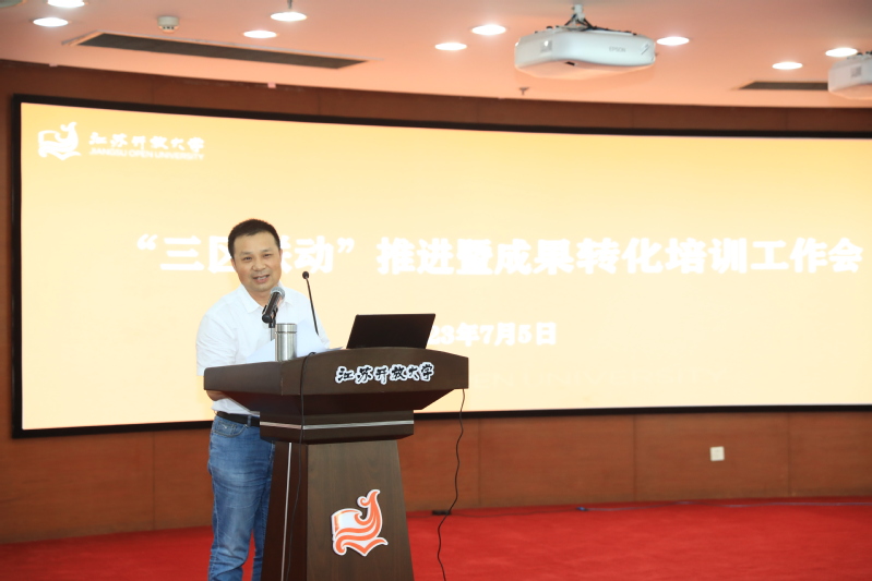 7月5日上午,我校在定淮门校区二楼报告厅召开“三区联动”推进暨成果转化培训工作会,本次会议的主要内容是开展成果转化培训、动员教师深入企业及开展科研诚信教育。校党委常委、副校长吴光林出席会议作讲话,南京工程学院科技与产业处处长韩冰教授作成果转化培训讲座。各学院院长及分管科研工作副院长,宣传部、人事处、科技处、学科建设处、社会教育处、教育科学研究院、老年文化与艺术研究所等部门负责人,各学院系/部主任、科研平台负责人、学院副高职称以上教师和博士代表近200人参加会议,青海开放大学及部分市县开放大学的教师通过腾讯会议室线上参加了培训会。