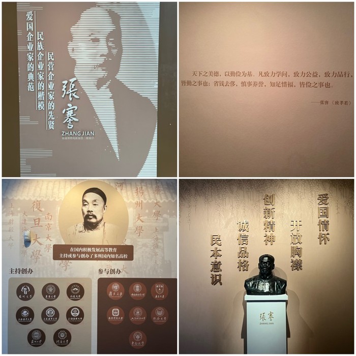 馆内陈列着张謇的手稿、书法作品,并用展板详细记载着他的生平。团队成员通过视频、图画、文物等形式,全面了解张謇先生艰苦创业、实业兴邦的一生。体会着张謇先生秉持兼济天下苍生的追求,把实业收入悉数用于办教育、修水利、建市政、广慈善,全方位致力于家乡民生改善,展现了为百姓谋幸福、为社会做贡献、为国家尽责任的博大情怀。