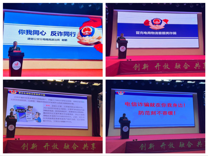 下半场由谢鹏警官为大家带来题为《你我同心,反诈同行》的反诈安全讲座,谢警官通过发生在同学身边的真实受骗案例,梳理了冒充熟人类诈骗、网络游戏产品虚假交易类诈骗、冒充电商物流客服类诈骗、刷单返利诈骗、虚拟中奖类诈骗、虚假网络贷款类诈骗等六种常见典型的网络诈骗手段。同时他将自己总结的防骗锦囊“三不一要”即“不轻信、不透露、不转账,要及时报警”传授给在场的同学们,提醒大家加强识别能力,筑牢安全防火墙,一旦发现上当受骗,及时向公安机关报案。最后,谢警官特别提醒同学们要小心6种行为可能触犯“帮信罪”,提高辨别和防范,不让自己的“热心肠”变成他人的“替罪羊”。