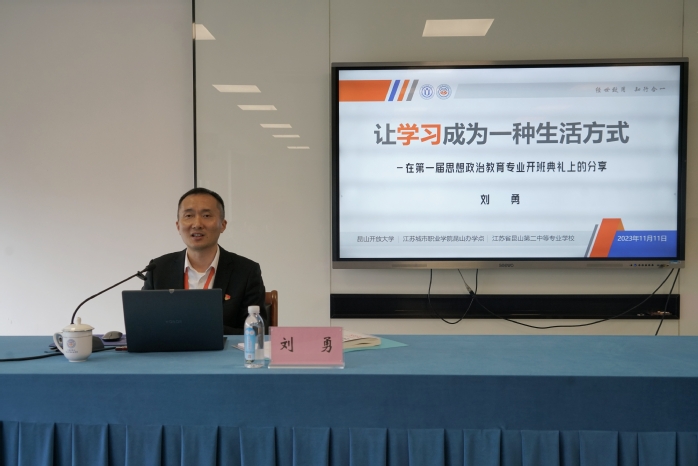 11月11日上午,我校在昆山开放大学举行了2023年秋季学期思想政治教育本科专业开放新生开学典礼。昆山开放大学党委书记刘勇、校长徐辰,我校马克思主义学院院长季海菊、设计学院院长姜春艳、马克思主义学院副院长陆洋等人出席了开学典礼。此次典礼采用线上线下相结合的形式,马克思主义学院和昆山开放大学教师代表、思想政治教育专业全体新生线下线上同步参加开学典礼。开学典礼由昆山开放大学副校长杨玲主持。