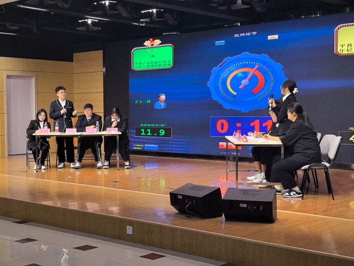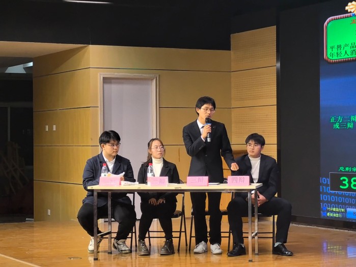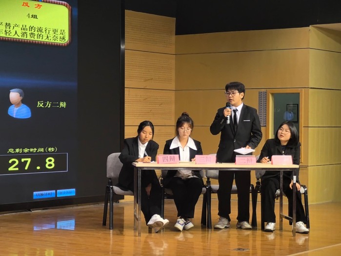 经过前期初赛的选拔,共有四支队伍脱颖而出,顺利进入学院决赛。四支队伍分为两组上场,围绕辩题“平替产品的流行更是当代青年精致感/无奈感的体现”展开激烈的思辨。正方代表队的观点为平替产品的流行更是年轻人消费精致感的体现,反方代表队的观点则为平替产品的流行更是年轻人消费无奈感的体现。正方从精致感与无奈感的定义入手,结合近年来年轻人的相关消费数据以及消费情况进行分析阐释,反方则从平替产品的质量入手,并举出相关实例,将精致感与生活态度相关联进行质询。
