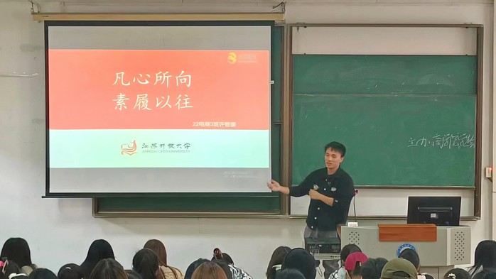 2022级电子商务3班许智康以“凡心所向,素履以往”为主题,结合自己经历,用一个个生动的例子向同学们展示如何在江开的校园生活里践行“平凡中育非凡”的核心精神。