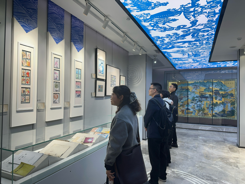 在寻觅探访西津渡古街之后,调研团队还参观了非物质文化遗产保护中心暨镇江民间文化艺术馆。在民间艺术精品展馆中,调研团队见识了剪纸、扎染画缋、铜板彩画、烙铁画、玻璃雕刻、蛋雕、根雕、陶塑、邮票拼贴画、竹编、竹笛等工艺的神巧;在白蛇传传说文化展示厅中的“水漫金山”四折幕影院体验到了“水漫斗法”的壮观场面,并从近百件实物作品和图文资料中感受到了“白蛇传传说”的文化魅力。
