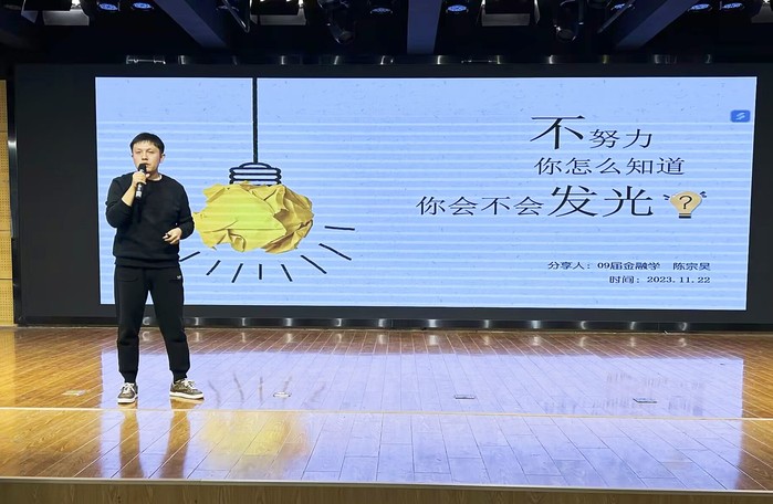 陈宗昊以“不努力,你怎么知道你会不会发光”为题,向学弟学妹们讲述自己在校期间的学习生活和毕业以后丰富的求职创业经历。他强调在校学习和社会实践能快速提升专业知识和实践技能,职场中更加看重求职者的综合实力,因此他鼓励在校生应关注自身综合素养的提升,全方位培养自己的能力。