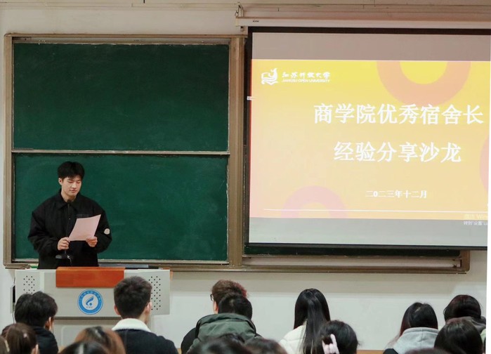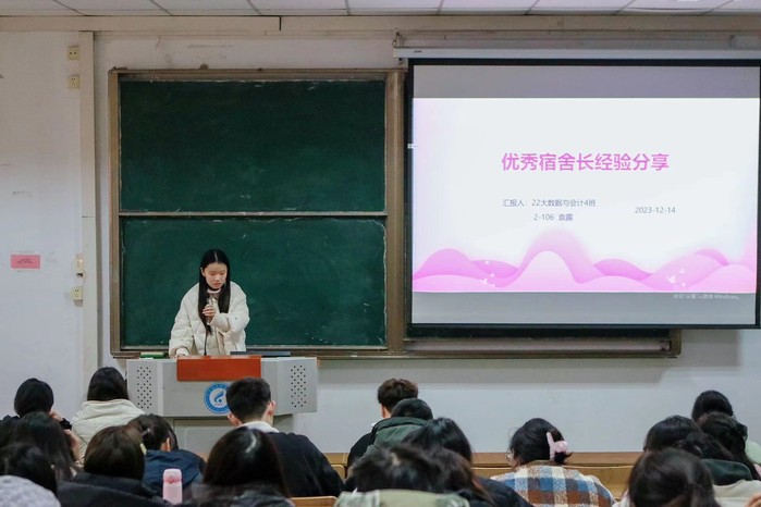 为提升学院宿舍长管理能力,加强以宿舍为单位的校园安全建设,营造积极向上的宿舍环境,商学院于2023年12月14日12:00在东校区1-2阶梯教室举办优秀宿舍长经验分享沙龙。本次活动由学生干部谢宇主持,商学院党总支副书记丁晓华、王姣姣老师及2023级全体新生宿舍长参加。