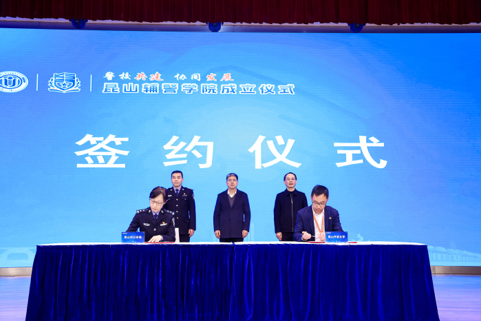 仪式上,在我校党委副书记牛玉韬、昆山市公安局政委刘伟、昆山市教育局局长王阳的共同见证下,昆山市公安局党委委员、政治处主任顾莹、昆山开放大学党委副书记、校长徐辰代表共建双方签约。
