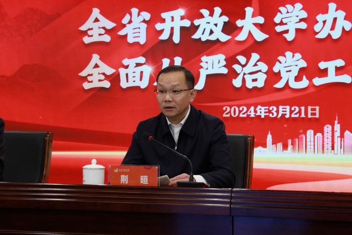 荆晅同志的报告全面总结了办学系统2023年全面从严治党工作,并对做好今年工作提出明确要求。他指出,全面从严治党永远在路上,党的自我革命永远在路上。党的十九大以来,我校坚持每年召开全面从严治党工作会议,自2020年起延伸到全省开放大学办学系统。2023年,学校党委以习近平新时代中国特色社会主义思想为指导,贯彻“严”的要求,坚持“实”的作风,用好“融”的方法,不断压实管党治党责任,扎实推进主题教育、校内巡察、审计整改、建章立制等各项工作,全面从严治党成果得到不断巩固。他强调,2024年是中华人民共和国成立75周年,是全面贯彻落实党的二十大精神的关键之年,是实施学校“十四五”规划的攻坚之年,也是贯彻落实省校第三次党代会精神的开局之年,高质量做好办学系统全面从严治党工作责任重大、意义深远。各级各校要深入学习贯彻习近平总书记关于党的自我革命的重要思想,坚决落实全面从严治党战略方针,坚持严的基调,突出精准监督,强化责任担当,注重常态长效,纵深推进全面从严治党。一要深入学习贯彻习近平总书记关于党的自我革命的重要思想,以“永远在路上”高度自觉纵深推进全面从严治党。二要构建党委领导、各负其责的工作格局,坚持党性党风党纪一起抓。三要发扬彻底的自我革命精神,坚定不移加强党的政治监督。四要永葆铁军本色,打造忠诚干净担当、敢于善于斗争的纪检监察干部队伍。最后,他强调,各级各校党组织和党员干部要坚决扛起全面从严治党的责任担当,积极营造有利于干事创业的良好氛围,以一往无前的奋斗姿态、永不懈怠的精神状态,立足高品质办学,赋能高质量发展。