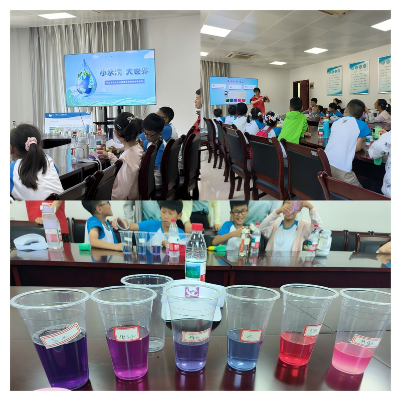 在科学实验课堂,实践团带孩子们走出社区,走进科学世界。大家一起聆听了水文局工作人员的介绍,了解了水的奥秘,认真学习了节水知识和妙招。随后,在实践团的帮助下,一场神奇的“紫甘蓝魔法变色秀”悄然上演。孩子们以小组为单位围在实验台前,眼中闪烁着求知光芒和按捺不住的兴奋,盯着实践队员将紫甘蓝汁分别滴入白醋、小苏打水等不同溶液中。随着液体的颜色瞬间变幻——遇酸变红、遇碱变绿,孩子们的惊叹声此起彼伏。这一场科学探索之旅,让抽象的化学原理瞬间变得鲜活灵动,求知的火种已被有趣的现象点燃,必将在孩子们幼小的心灵里持续燃烧。