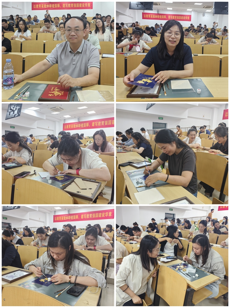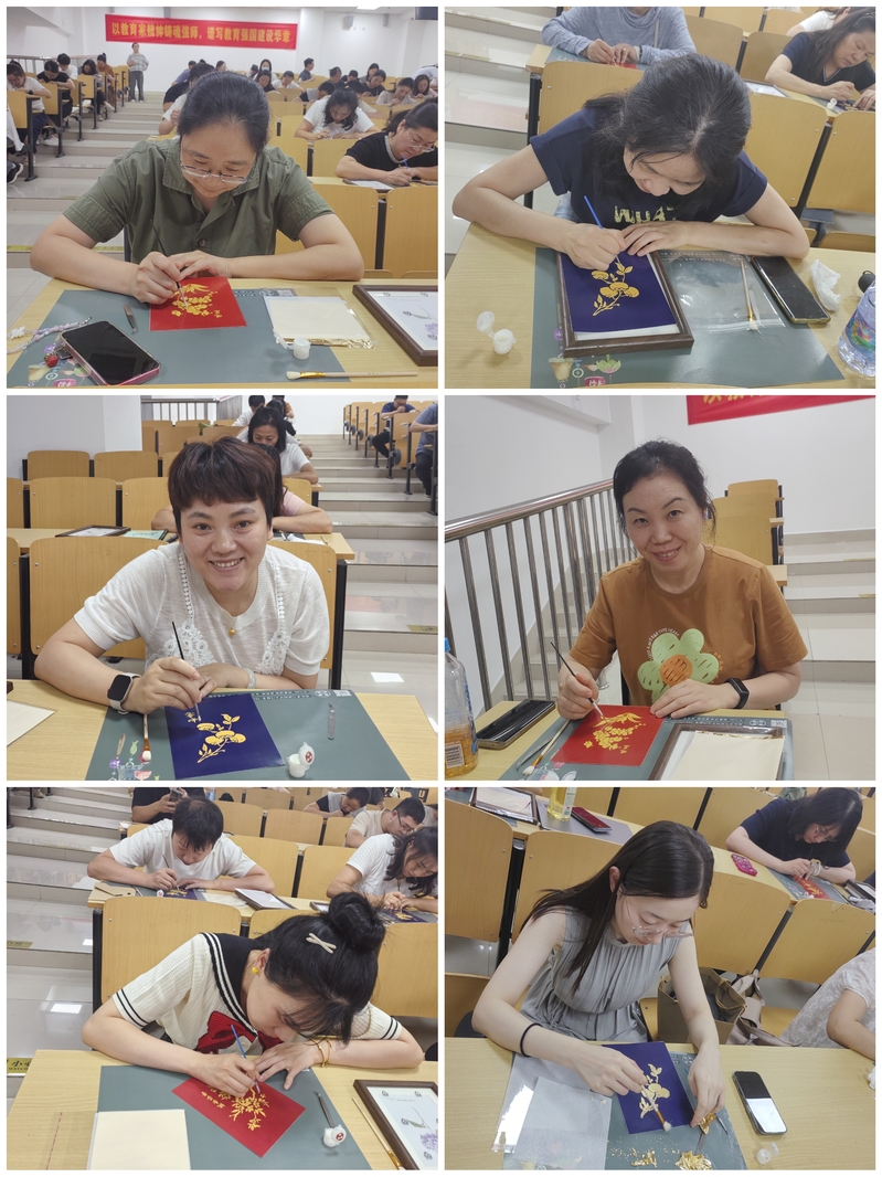 活动中,老师们认真聆听金箔的历史渊源与制作技艺,全面认知这项延绵千年的中华民族智慧结晶。在专业老师的悉心指导下,大家化身为非遗文化的学习者,或凝神静气勾勒线条,或小心翼翼粘贴金箔,以巧手为笔,金箔为墨,用心感受古老艺术与现代文化的绝美共鸣。金箔的光芒与欢声笑语交织,活动现场温馨又充满活力。
