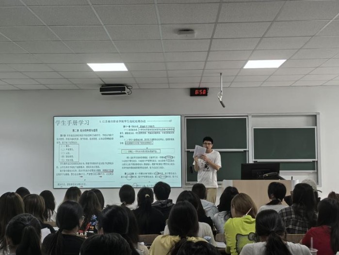 9月14日上午,新生入学教育和专业教育正式拉开帷幕。2025级各新生班辅导员和班主任组织全体新生召开主题班会,辅导员从军训须知、《学生手册》、开学分班考试的方面详细解读,再到反诈教育、学风建设、宿舍管理的细致要求,逐一进行介绍,帮助2025级新生快速融入充满活力的大学校园。专业教育环节,班主任以“学科特色+职业规划”为主线,为新生描绘绚丽的成长蓝图。