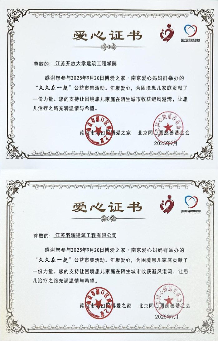 令人感动的是,学院的优秀校友企业——江苏羽澜建筑工程有限公司与江苏犇犇建设工程有限公司共同向“久久在一起”公益市集捐赠3000元善款。这笔款项满载着企业与校友的深情厚谊,将悉数用于“宁馨小家”公益项目,为异地来宁就医的患儿家庭提供短期免费住宿与综合关怀服务。