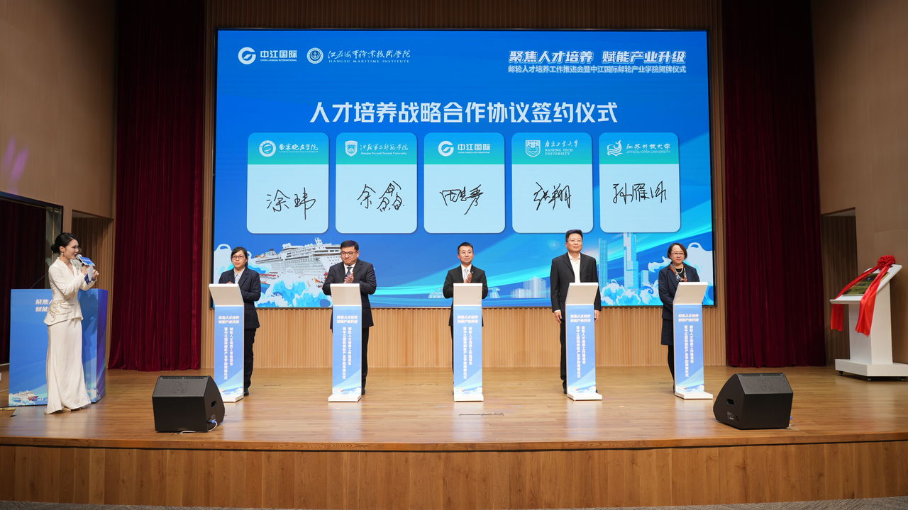 在本次活动中,“中江国际邮轮产业学院”正式揭牌成立,旨在汇聚各方智慧,共商邮轮人才培养大计,推动产教深度融合,打造邮轮人才培养高地。立足前期与中江国际合作的基础,活动现场,孙雁冰代表外国语学院与江苏中江国际人才发展有限公司签订人才培养战略合作协议,这一协议的签订,是外国语学院与中江国际集团深化合作的又一成果。双方将在人才培养方面开展更加深入、广泛的合作,共同探索创新人才培养模式,培养更多适应市场需求的高素质专业人才。