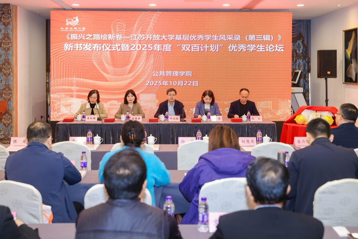 10月22日,江苏开放大学公共管理学院在南京举行《振兴之路绘新卷——江苏开放大学基层优秀学生风采录(第三辑)》新书发布仪式暨2025年度“双百计划”优秀学生论坛。江苏开放大学党委副书记牛玉韬出席活动并致辞,江苏开放大学党委宣传部部长杨濯、党委学生工作部部长刘慧英、南京出版社人文社科图书编辑部主任张龙出席活动并共同为新书揭幕。来自全省各地的优秀基层村(社区)干部学生代表齐聚一堂,共话基层治理与乡村振兴的实践与展望。
