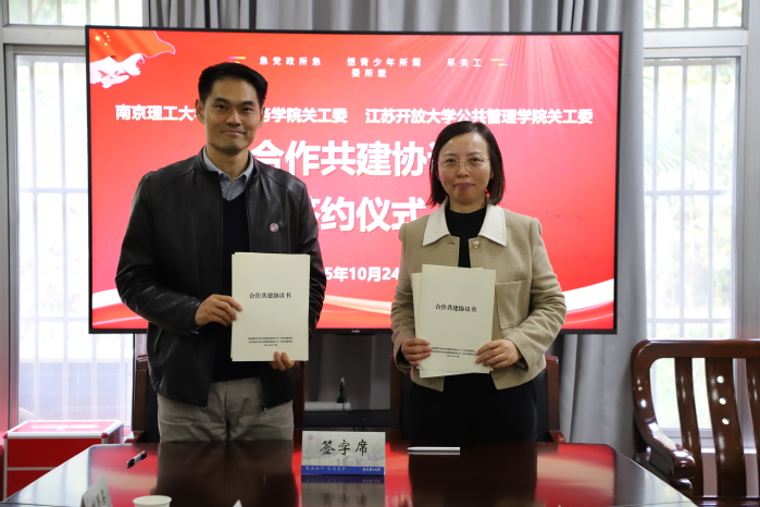 秋意渐浓,情谊正暖。10月24日上午,江苏开放大学公共管理学院与南京理工大学公共事务学院关心下一代工作委员会合作共建签约仪式在南京理工大学举行。仪式由南京理工大学离退休党委常务副书记、关工委秘书长刘明梁主持,南京理工大学关工委常务副主任项银康、江苏开放大学关工委常务副主任金丽霞及两校关工委、学院相关负责同志齐聚一堂,共同见证这一重要时刻。