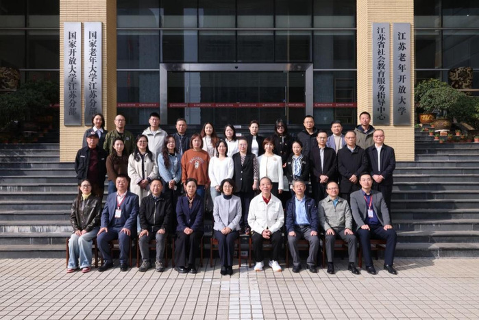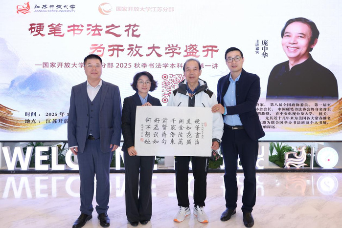庞中华先生随后向学校赠予作品,副校长张晓代表江苏开放大学表示感谢,并合影留念。