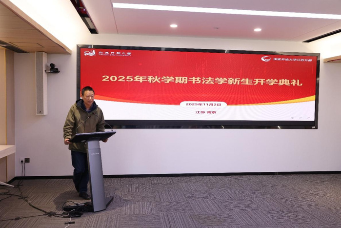 江苏开放大学副校长张晓发表热情洋溢的致辞,她指出学校始终以传承中华优秀传统文化为使命,高度重视书法学专业建设,聘请多名书法家担任授课教师,不断提升书法学专业教育教学水平。她勉励同学们一要心怀热爱,将个人成长与专业发展有机结合起来,传承文化根脉;二要平衡兼顾,统筹好工作、学习和生活,自主学习、快乐学习、高效学习,在不断学习中实现个人全面发展;三要守正创新,积极参与社会实践,在书法实践中强化艺术积累,积极运用人工智能等工具,在坚守传统中探索书法艺术的无限可能,用笔墨绘就属于自己的时代华章。