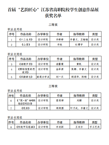 近日,省教育厅公布了首届“艺韵匠心”江苏省高职院校学生创意作品展获奖名单。此次,我校遴选的学生作品从447件作品中脱颖而出,斩获奖项8项。其中,获职业应用组二等奖2项,三等奖2项,职业创意组二等奖3项,三等奖1项,并有5件优秀作品亮相现场展览。