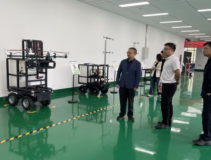 在江苏智雾科技发展有限公司,团队现场考察了微纳米雾化设备及生产车间,了解产品在精准施肥、减量施药等领域的应用效果与前景。双方就肥料、农药与雾化系统结合实现同步减量开展深入交流,初步商定围绕一体化喷施工艺开发、田间试验设计和数据共享等合作。