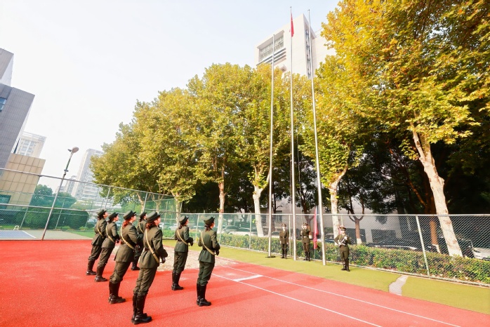 升旗仪式在庄严的国歌声中进行,鲜艳的五星红旗伴随着激昂旋律冉冉升起。