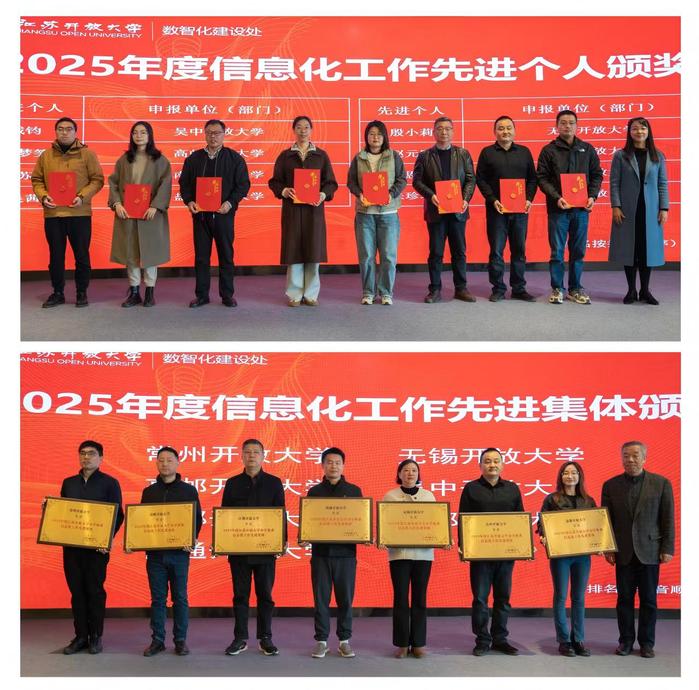 在随后的表彰仪式上,罗逾兰副校长为戴钧等20名教师颁发了2025年度信息化工作先进个人奖项。杭祝洪副校长为常州开放大学等7家单位颁发了2025年度信息化工作先进集体奖项。