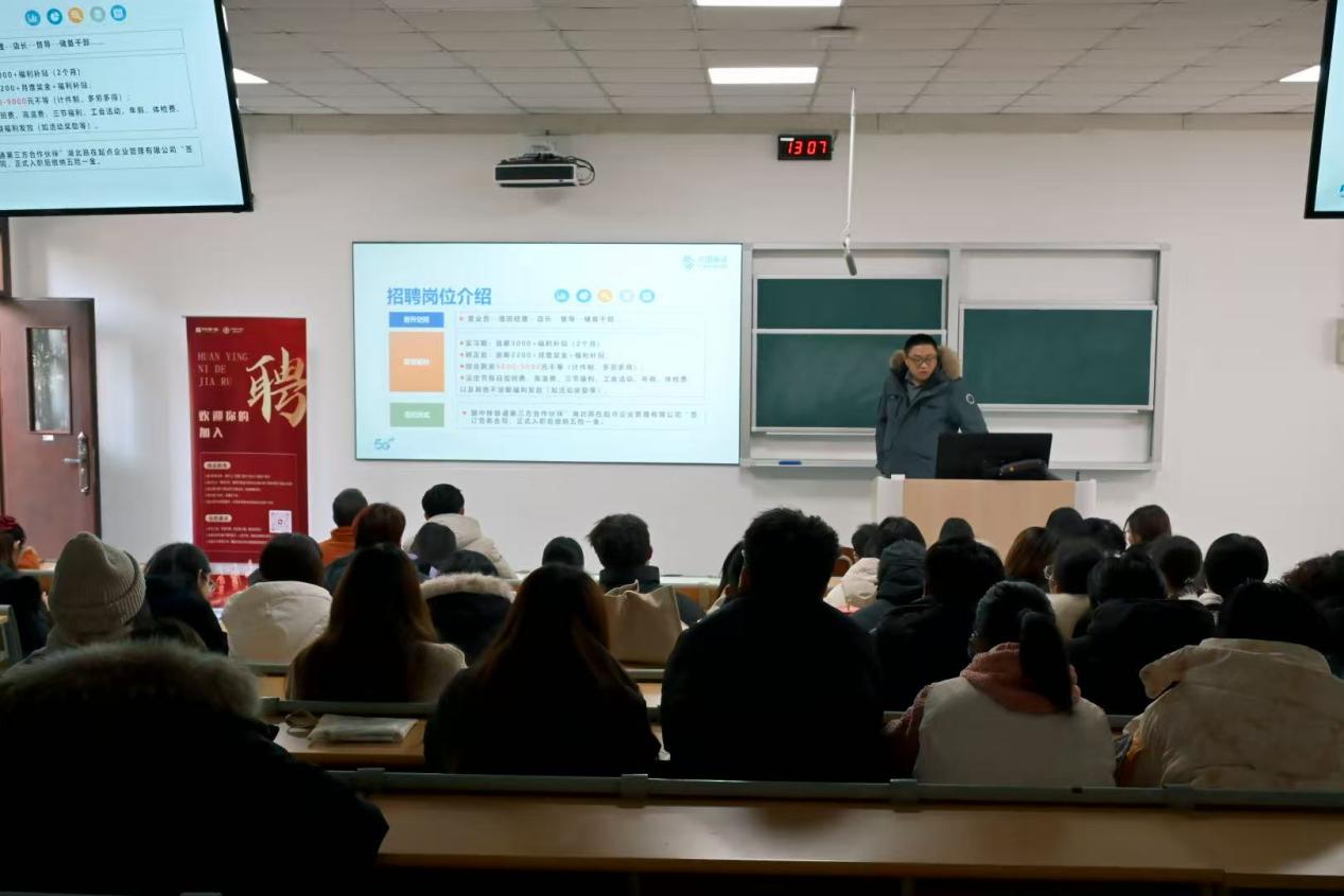 为扎实推进2026届毕业生就业工作,抢抓秋招黄金期,搭建精准就业桥梁,助力学院2026届毕业生充分就业,12月16日,设计学院在东校区教学楼1阶1教室举办2026届毕业生招聘会。本次宣讲会由设计学院就业干事魏若思主持,学工处就业创业科科长朱福硕、企业代表及2026届部分毕业生参加。