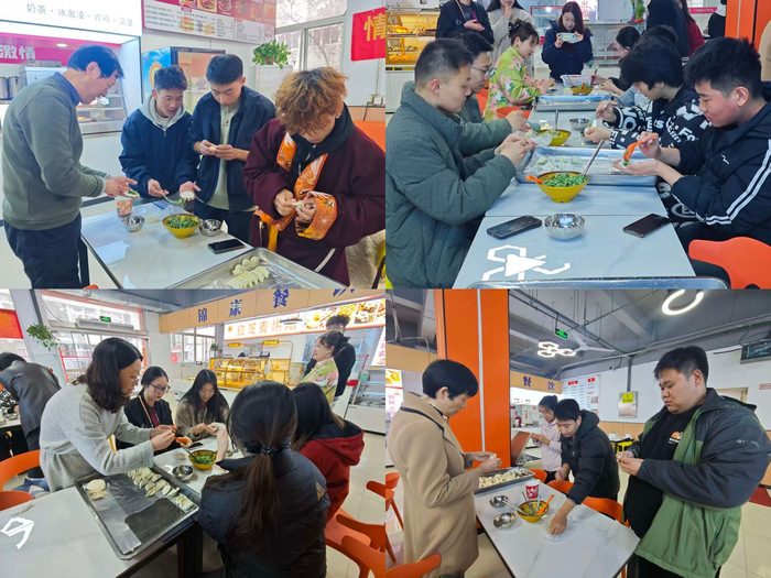 包饺子的过程中,师生们围坐一团,边忙活边畅谈。从学业上的困惑到生活中的趣事,从家乡的冬至习俗到未来的规划憧憬,亲切的交流让陌生感渐渐消融,默契在协作中悄然滋生。当第一锅热气腾腾的饺子和酥脆金黄的春卷出锅时,香气瞬间弥漫整个食堂。师生们围坐在一起,品尝着自己亲手制作的美食,搭配学院精心准备的爽口凉菜,每一口都饱含着劳动的喜悦与家的暖意。欢声笑语中,寒冷的冬日仿佛被这温情驱散,每个人的脸上都洋溢着幸福满足的笑容。