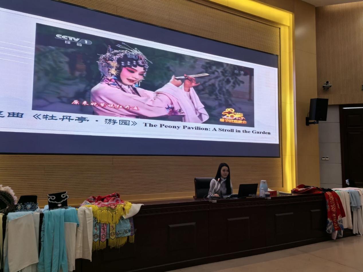 最富挑战的是唱词体验。老师选取了《牡丹亭·游园》中的经典片段《皂罗袍》。“原来姹紫嫣红开遍……”在老师逐字逐句的带领下,留学生们尝试用昆腔的“水磨调”吟唱。大部分学生第一次接触中文的曲牌体唱词,借助标注的拼音模仿音调。