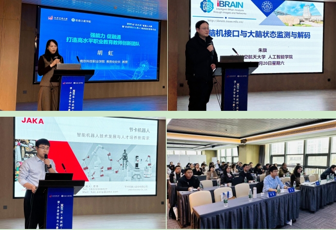 赛事期间,同步举办了“具身智能与机器人”高质量发展研讨会。机器人领域专家、企业代表及各高校参赛教师共同出席。南京科技职业学院教务处处长胡虹教授、南京航空航天大学人工智能学院副院长朱旗教授、节卡机器人股份有限公司方案总监庞浩,分别就《强能力促融通:打造高水平职业教育教师创新团队》《脑机接口与大脑状态监测与解码》《智能机器人技术发展与人才培养新需求》等主题进行分享。与会专家与教师围绕人工智能时代背景下机器人领域的人才培养路径、课程体系重构与教学实践创新等议题展开深入探讨,旨在为面向未来的复合型科技人才培养凝聚共识、探索方向。