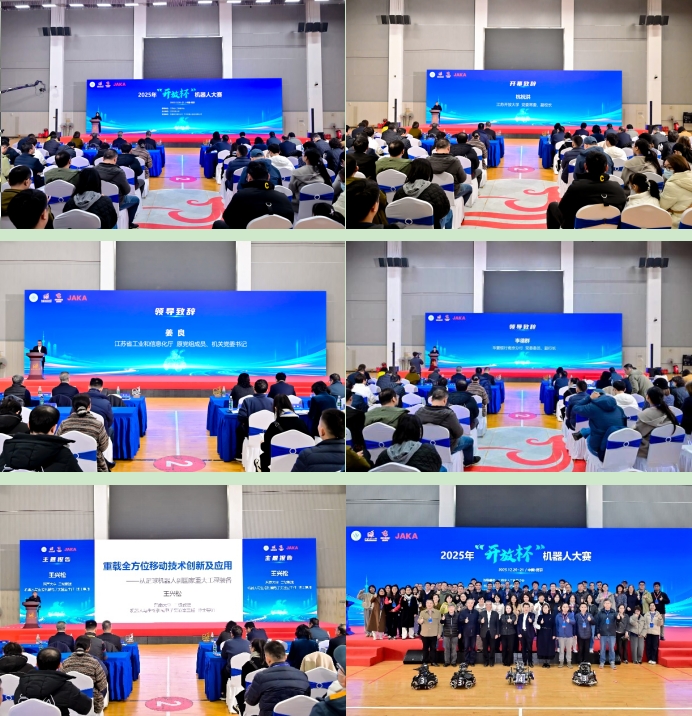 江苏开放大学党委副书记、校长张迎春出席大赛开幕式。学校党委常委、副校长杭祝洪,江苏省工业和信息化厅原党组成员、机关党委书记姜良,华夏银行南京分行党委委员、副行长李德群一同出席并致辞。东南大学机器人与生物机械电子实验室主任王兴松教授作题为《重载全方位移动技术创新及应用——从足球机器人到国家重大工程装备》的主题报告。
