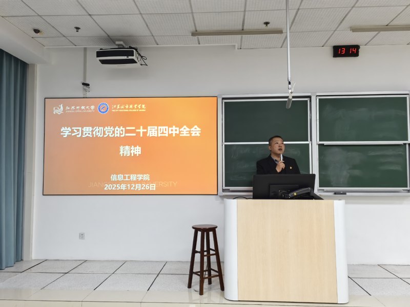 2025年12月26日,信息工程学院在阶梯教室201召开全体教职工大会,专题学习党的二十届四中全会精神,解读《江苏开放大学(江苏城市职业学院)教师师德失范行为负面清单及处理办法》。学院党总支书记王小军主持会议并领学,全体教职工参会。