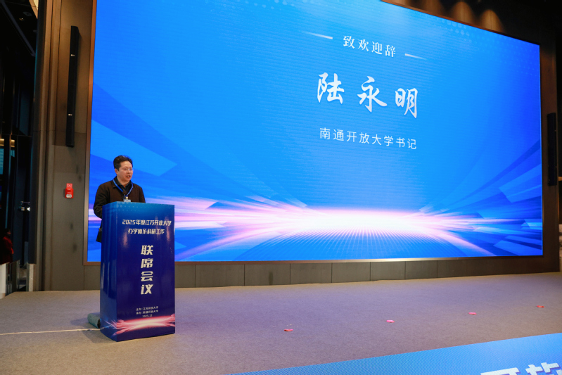 南通开放大学党委书记陆永明致欢迎辞,对省校的信任和支持表示感谢。他表示,学校将以产研服务中心建设为契机,深化产教融合、校地协同,努力打造服务区域经济社会发展的开放教育新范式。