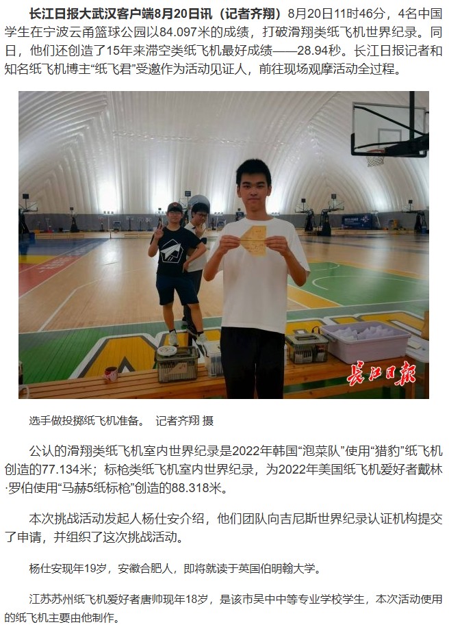 数月后,他们带着更成熟的技术、更镇定的心态再度启程。12月28日在上海的最终挑战中,每一个动作都凝结了此前积累的经验与调整,最终纸飞机平稳升空,划过一道优美而坚定的弧线——新纪录诞生。