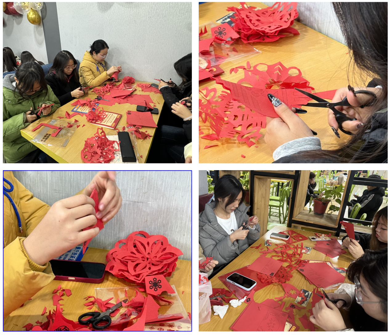 活动现场特别设置了“剪窗花”非遗体验区。在工作人员的细心指导下,师生们兴致勃勃地学习传统剪纸技法,创作出一幅幅寓意吉祥的窗花作品。优秀作品被装饰在舞台背景和食堂墙面上,为现场增添了浓浓的传统年味。