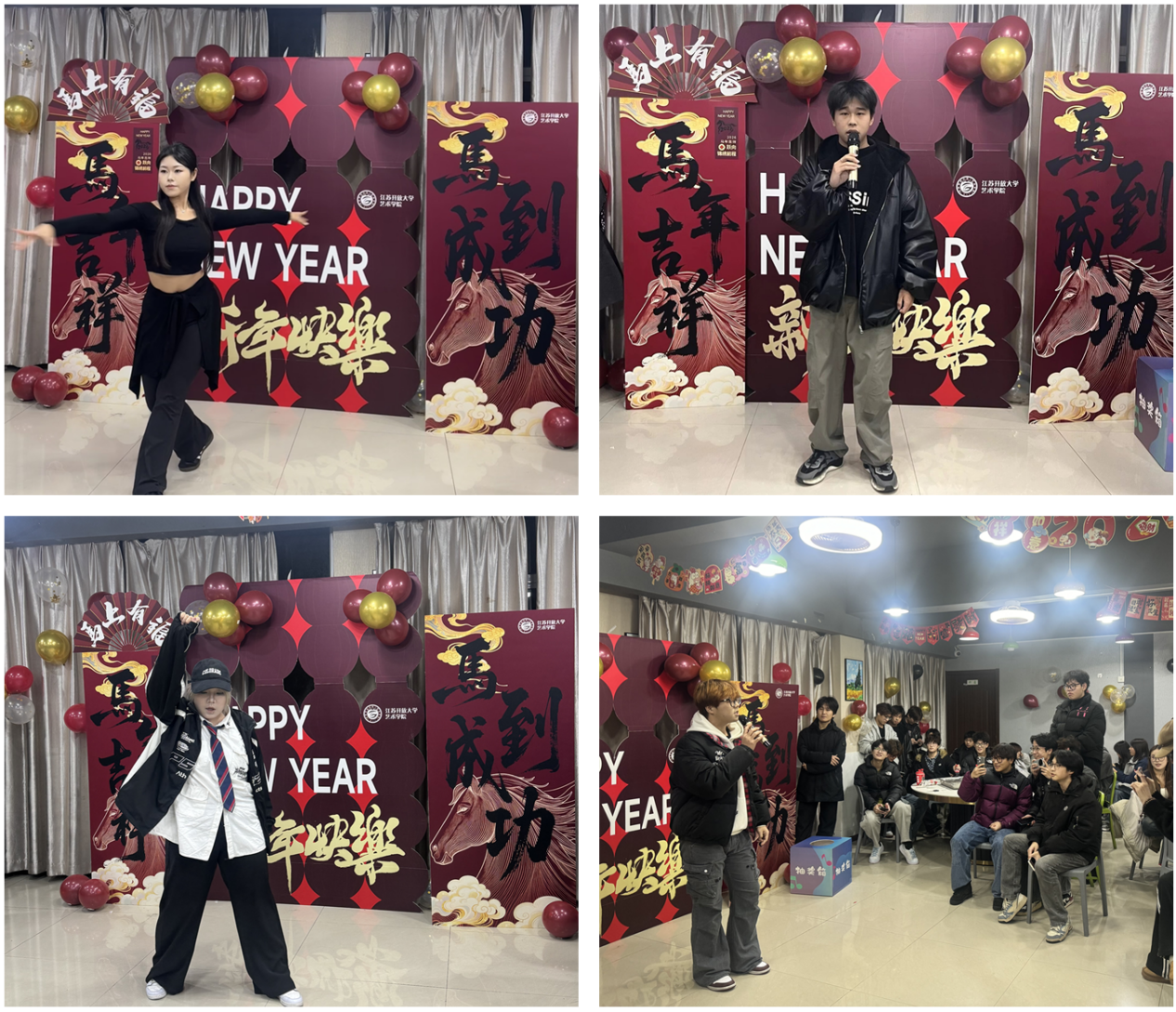 活动尾声,师生们合影留念,互道新年祝福。本次新年联欢活动不仅是一场欢乐的聚会,更是一次生动的实践与美育课堂,增强了学院的凝聚力与归属感,为全体师生留下了美好而难忘的新年记忆。相信在新的一年,艺术学院的学子们将以更昂扬的斗志劈波斩浪,追逐梦想。全院老师也将继续全心奉献,引路护航,助力学生成长成才。