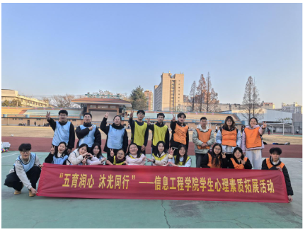 为深入践行 “五育并举” 育人理念,扎实推进学生 “一站式” 社区建设,以心理育人为纽带凝聚青春力量,12月28日,信息工程学院在应天校区操场开展“五育润心 沐光同行”学生心理素质拓展活动,来自学院不同班级的30余位学生参与,共度充实而有意义的一天。