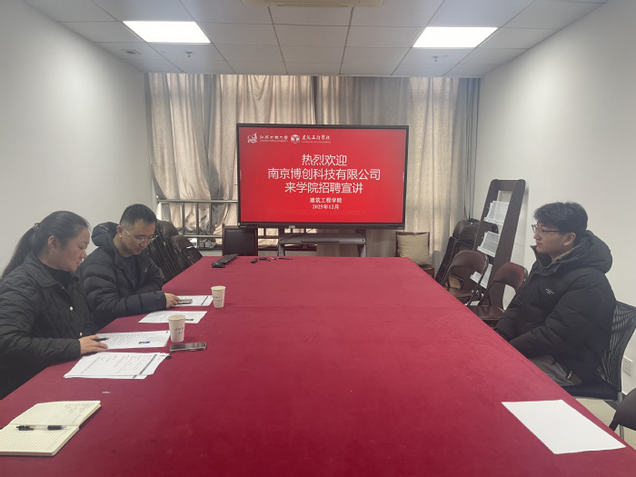 2025年12月31日上午,建筑工程学院与南京博创科技有限公司携手打造的专场招聘面试活动在学院会议室圆满举行。本次活动以“深化产教融合、精准对接需求”为核心目标,通过“面对面选拔+零距离指导”的创新形式,为建筑设备系学子搭建直通企业的就业桥梁,学院党总支副书记徐亚携建筑设备系主任韦定兵、两位班主任蒋玉龙、孙陈橙参与组织,企业方由总经理王海波、副总经理王素娟率队出席,彰显了校企协同育人的生动实践。