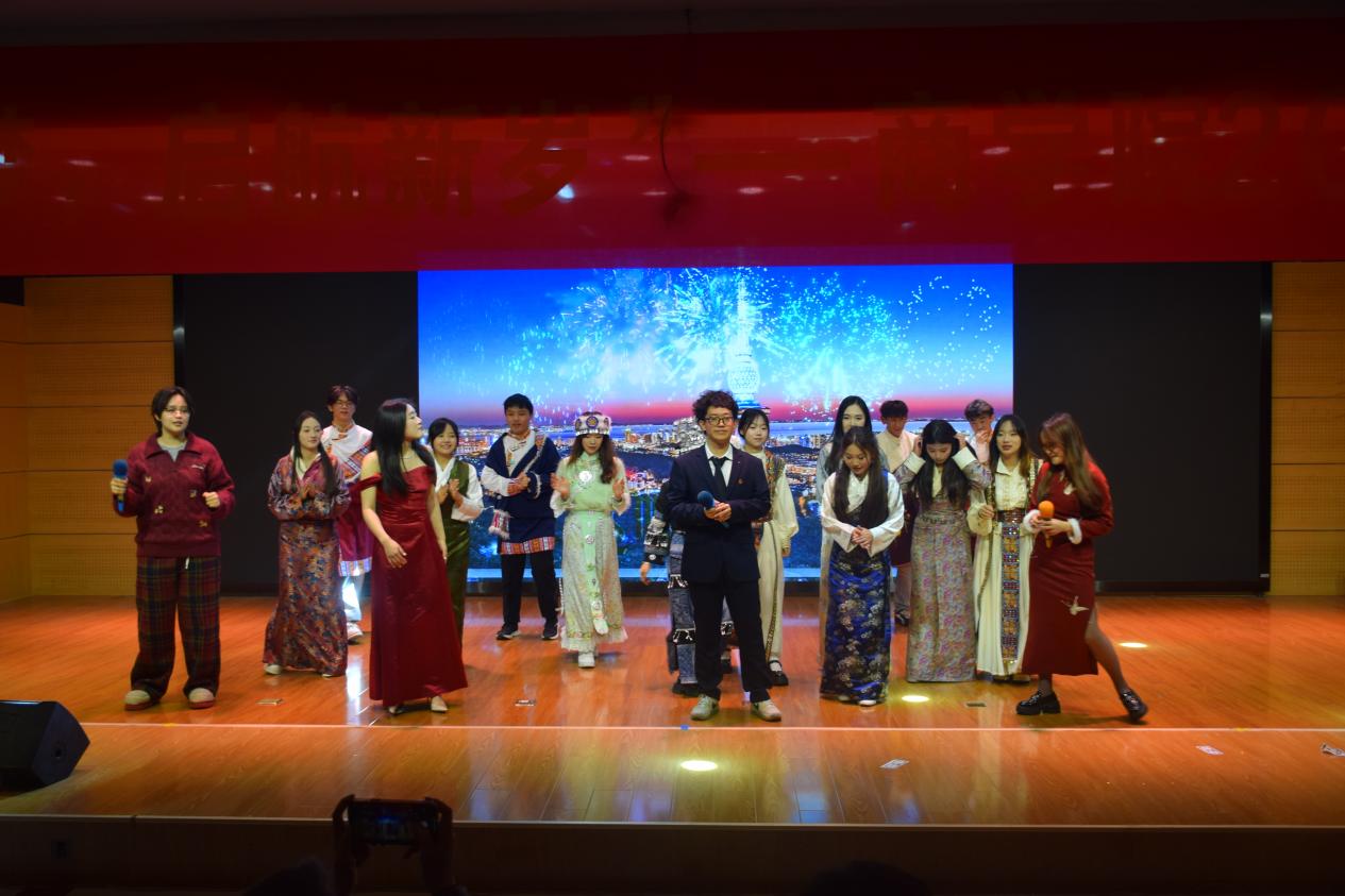 精彩纷呈的节目轮番登场,点亮整场晚会。美轮美奂的舞蹈、悠扬婉转的歌曲、诙谐逗趣的相声接连上演,舞台之上光影流转,传统韵味与现代活力碰撞交融,各民族一家亲,尽显喜庆热烈的氛围;台下观众热情高涨,掌声、欢呼声与叫好声此起彼伏,汇成一片欢乐的海洋。晚会在大合唱《冲动》的旋律中落下帷幕,激昂的歌声满含对祖国的深情礼赞,更彰显商学院学子在新时代奋勇前行的青春姿态。