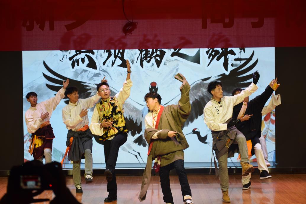 藏族同学带来的群舞《黑颈鹤之舞》紧随其后,独特的民族风情与整齐划一的舞姿,尽显多元文化的交融共生,赢得全场喝彩。