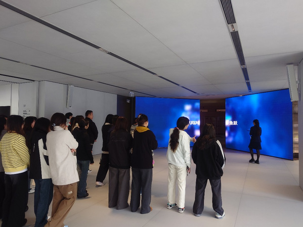 在指导老师陈震与企业导师费凡的带领下,设计学院“虚拟现实应用技术”课程的学生又前往鱼跃集团进行走访交流。他们首先参观了被誉为“工业设计的美术馆”的鱼跃集团展厅,这座融合科技美学与虚拟体验设计的空间,本身就是一件精妙的工业设计作品。