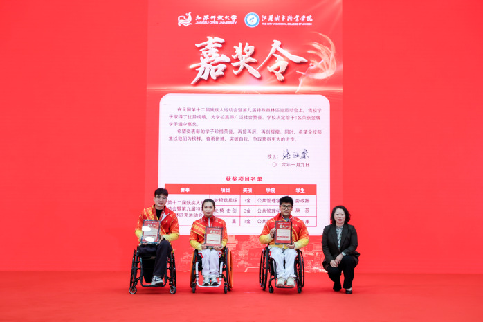 张迎春为在全国第十二届残疾人运动会暨第九届特殊奥林匹克运动会上获得金牌的公共管理学院三名开放学生——康苏、彭政扬、张平康颁发校长嘉奖令,以表彰他们取得的突破性成就,致敬他们永不言弃的精神。
