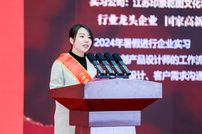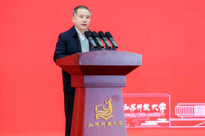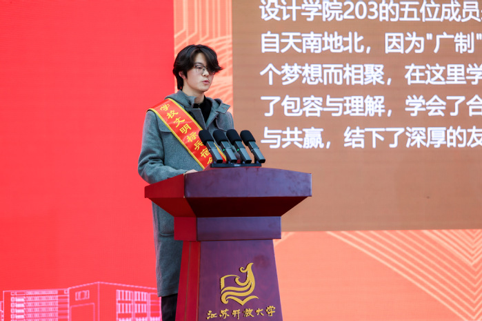 讲话中,丁荣余引用《梁启超家书》名句与师生共勉:“只要我们努力,我们就是第一等人物。”他语重心长地指出,人生没有白走的路,“该走的路不走,你就无路可走;该学的不早学,你将有机无遇。”结合教育强国建设大势与数智化时代浪潮,丁荣余提出三点希望:一是把 “终身学习” 刻进成长坐标,筑牢向上根基。以经济学“复利效应”为喻,鼓励同学们将学习融入日常,在日积月累中汇聚成长动能,让每一份努力都沉淀为成长的养分。二是以“开放融合”激活创新动能,拓宽向上路径。依托学校“江苏OPC开放社区”“三千江苏开放教授”等资源,尝试“专业+ AI”跨界实践,成长为“超级个体”。三是将“时代使命”融入青春征程,彰显向上价值。他勉励同学们主动关心时事、涵养世界眼光,把专业技能转化为服务社会的能力。要做到“拼命学、拼命玩”,学出真本事、玩出高格局,在服务社会中实现人生的最大价值。他希望大家以今日荣誉为新起点,在终身学习的道路上步履不停,在开放创新的实践中勇攀高峰,在服务社会的征程中续写新篇,绽放属于江苏开大人的独特光彩。